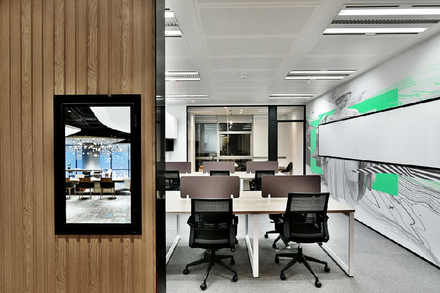 办公空间设计中应注意干部办公室的独立性,与普通员工区域区分开,通常为部门主观而设,但应紧靠员工办公区并且办公桌应面向员工方向,门与隔墙采用玻璃或其他通透材料。